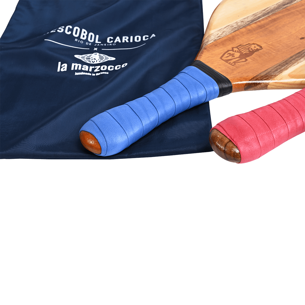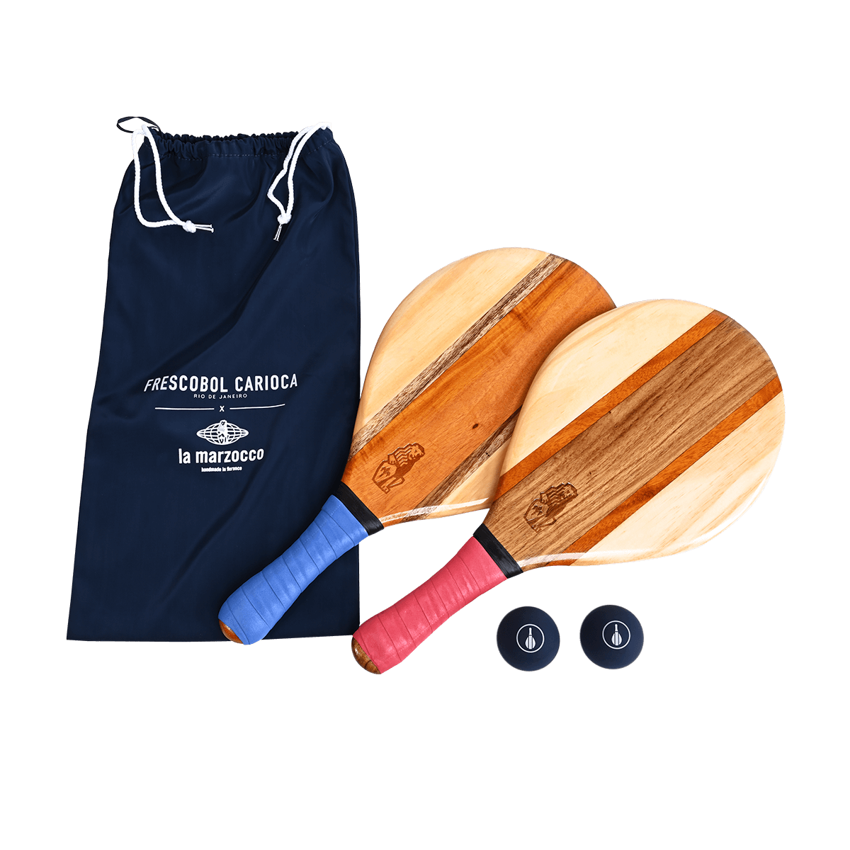Questo set di racchette da spiaggia Frescobol Carioca x La Marzocco è realizzato artigianalmente da artigiani locali, conosciuti come i marceneiros, utilizzando cinque pezzi di legno brasiliano proveniente da fonti sostenibili e stampato a caldo con il logo di La Marzocco, prima di essere rivestito con una resina naturale impermeabile e resistente alla sabbia e rifinito con una presa in neoprene.